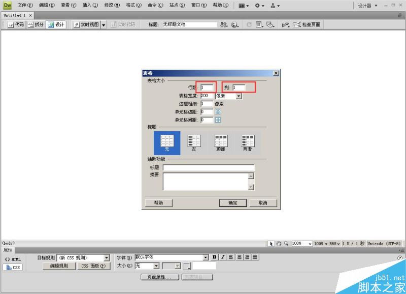 2、创建1行1列表格;