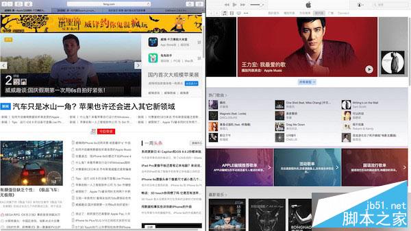 首先是 Split View,大家对于这个英文单词应该不会陌生,因为最早在 iPad Air 2 我们已经听过这个名字了。Split View-分屏视图,一方面可以同时运行两个应用,同时又可以让你在全屏界面中专注于某一个应用。只需按住打开应用左上角的放大按钮(绿色)便可以拖拽到屏幕的左边或右边(占据屏幕一半),其它的已打开应用则会出现在另一边供选择,点击一个应用便可以让该应用占据屏幕的另一侧。如果想要调整两个应用窗口的大小比例,拖动中间的分割线即可。这时候一边听 Apple Music,一边写稿;或者一边浏览网页,一边将有用的信息记录在备忘录中就变得更轻松了。