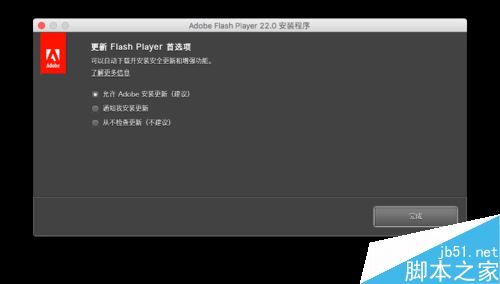在弹出的“ Adobe Flash Player ”的界面上勾选“我已阅读并同意 Flash Player 的许可协议的条款”,点击“安装”。选中“允许Adobe安装更新”,点击“完成”。