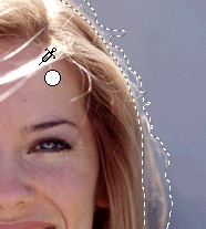 在本例中,因为内部选区线通过了一段比正常头发区域要暗一些的区域,所以,在处理图象时,该区域的前景色值没有得到有效的保存,形成缺陷. 可以从前景对象的合适区域中取色,然后将该色值补到缺陷区域,从而修复缺陷.使用放大功能,可以使点击补色区域更准确.处理图象后,可以输入不同的背景图像,以此来测试处理效果.1.点击内部注射器工具
