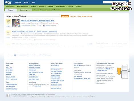 Digg通过只放置类别内容来保持好和清理的头部。头部的重点是用户,而页脚是着眼于公司。