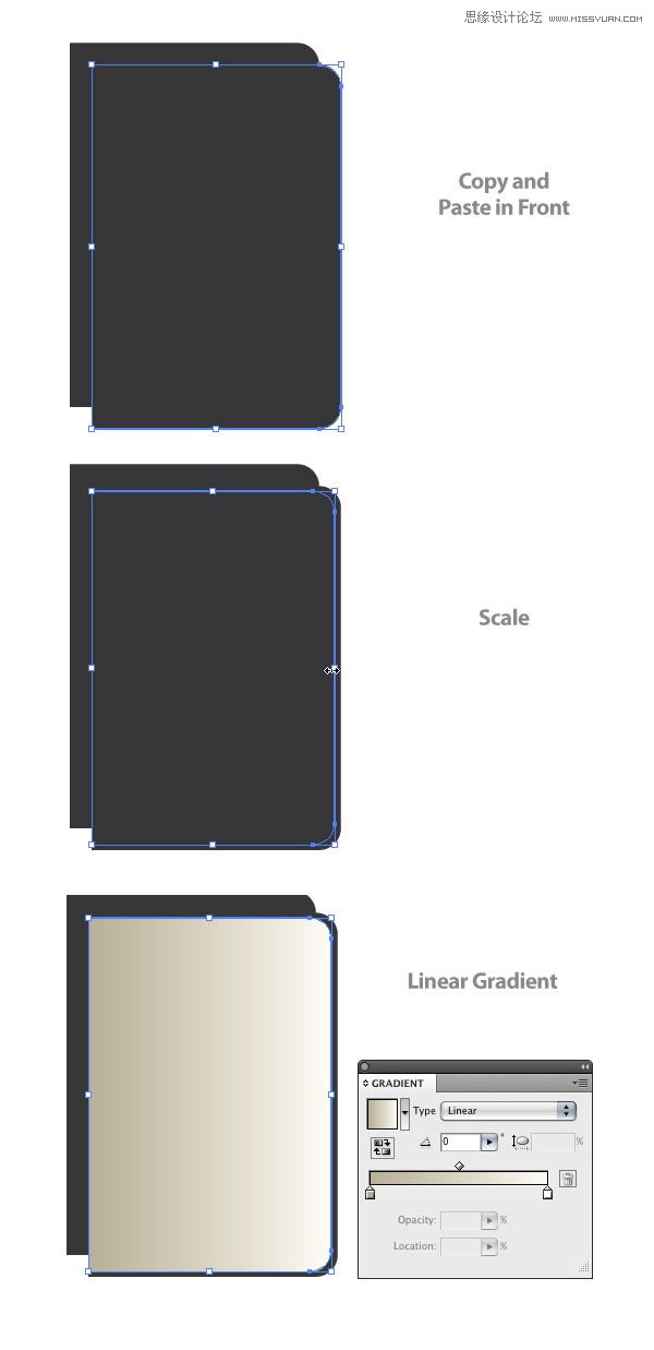 5、选中封皮形状的副本,复制(Ctrl+C),粘贴在前面(Ctrl+F)。选中副本,然后使用选择工具(V)从右向左缩小比例。在缩小时,按住 Shift键可以同比例缩小。缩小的副本填充线性渐变。在渐变中,第1个色标更改为深土黄(色),第2个色标更改为浅土黄(色)。