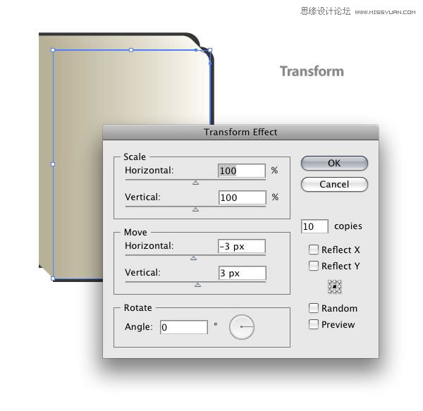6、选中土黄封皮形状,执行效果菜单>扭曲和变换>变换。弹出变换效果对话框,副本更改为10份/次复制,水平移动:-3,垂直移动:3px。现在我们得到了记事簿的内页。