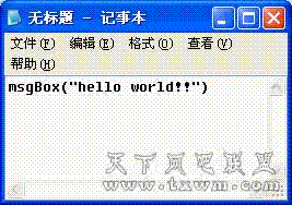 下面我们来编写一个经典的例程:hello world。我们要实现的就是如图1中的效果,要实现这一效果其实只须一条语句就行。具体做法如下:打开记事本,在编辑区输入“msgBox(“hello world”)”(如图2),然后以VBS为扩展名保存文件(“保存类型”里面选择“所有文件”,在“文件名”里面输入包括扩展名的文件名,如“hello world.vbs”),保存完成后直接双击保存的文件,效果就出来了。学过VB的朋友都知道msgbox函数是VB编程中最常用的函数之一,它可以实现弹出窗口提示信息。