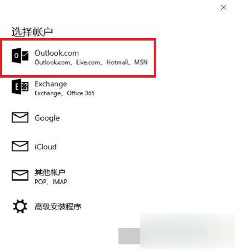 3、接下来选择帐户的类型: 如果你用的是 Microsoft 帐户,则点击第一个 outlook.com;如果你用的是企业帐户,则可以点击 Exchange;如果你用的是gamil,则点击 Google;如果你用的是 apple,则点击 iCloud;如果你用的是 qq,163 等国内的邮箱,一般点击其他账户(Pop,IMAP),如图: