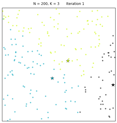 其中:N=200代表有200个样本,不同的颜色代表不同的簇(其中 3种颜色为3个簇),星星代表每个簇的簇心。算法通过25次迭代找到收敛的簇心,以及对应的簇。 每次迭代的过程中,簇心和对应的簇都在变化。