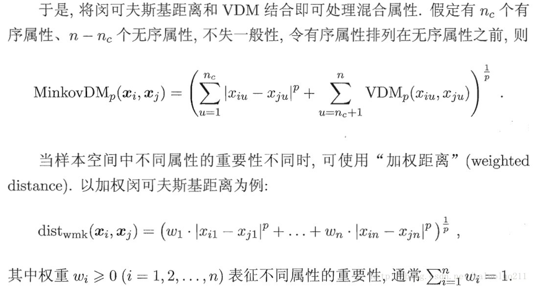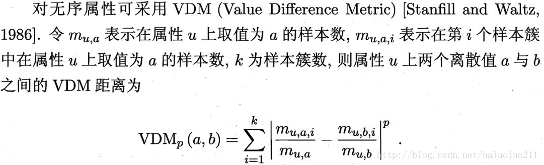 例如:色泽,青绿、浅绿、深绿(又例如: 性别: 男, 女, 中性,人yao…明显也不能使用0.1, 0.2 等表示求距离)。这些不能使用连续的值表示,求距离的,一般使用VDM计算: