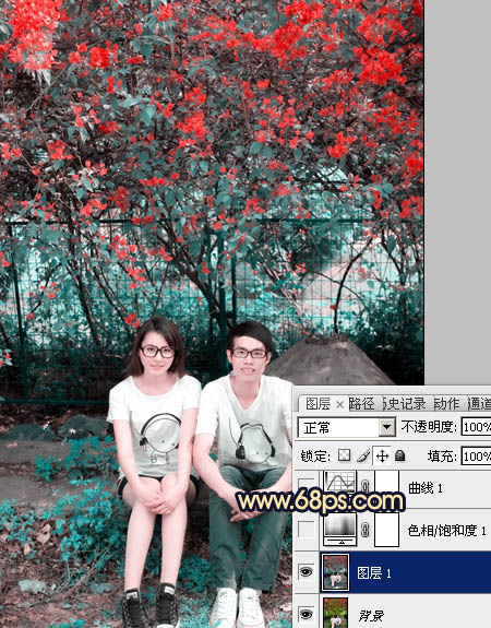 2、创建色相/饱和度调整图层,对红色及青色进行调整,参数设置如图2,3,效果如图4。这一步把背景青色转为蓝色,红色转为橙红色。