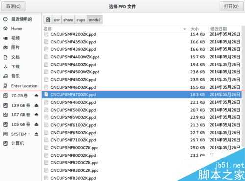 6、安装后进入刚才的打印机对话框,单击“型号”,在下拉列表中选择“提供PPD文件”。依次打开/usr/share/cups/model,找到需要的ppd文件,点击右上角的打开按钮即可