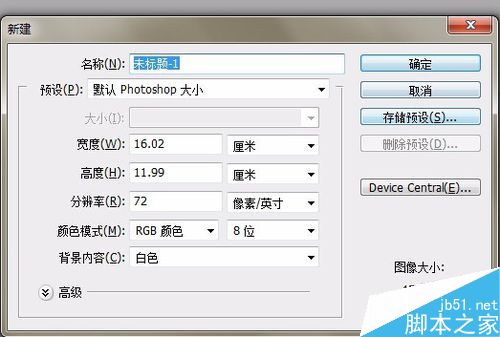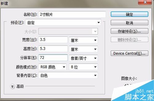 在弹出的对话框中,输入名称,大小,像素等,最后单击“确定”,新建一个2寸照片大小。