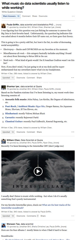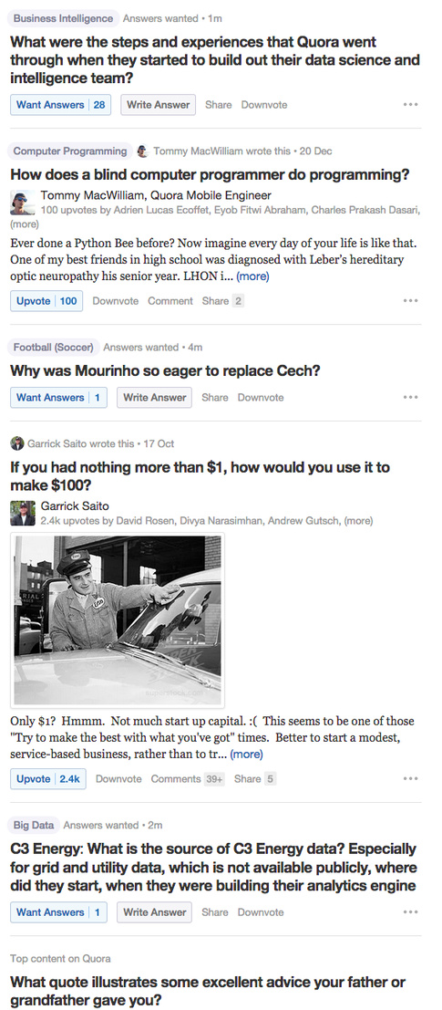 在Quora, 还有很多其他的排名应用,有些甚至不为人察觉。例如,对于一个答案点赞的用户名也是排序后显示的,目的是要将我们认为对于该问题/答案最有见识的用户排在最前。同样,对于特定问题显示可能的回答者时,那些推荐的用户也是排过序的。