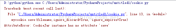 将上面的例子简单变形就可以得到本例,使用了CookieJar的子类MozillaCookiJar,为什么呢?我们将MozillaCookiJar换成CookieJar试试,下面一张图你就能明白: