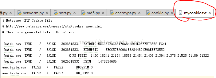 上面我们得到了cookie,下面我们学习如何保存cookie。在这里我们使用它的子类MozillaCookieJar来实现Cookie的保存