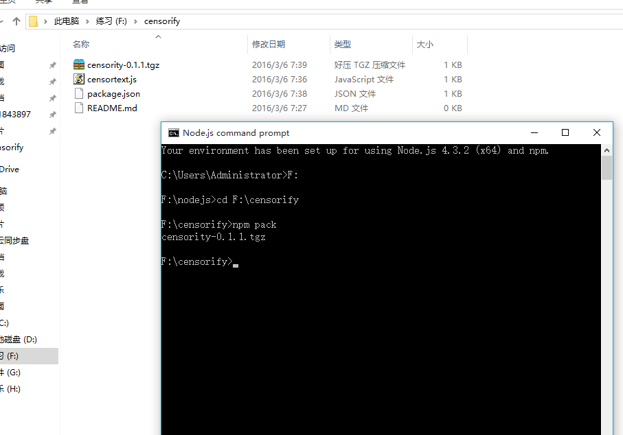 使用命令行导航到censorify文件夹下,然后使用命令 npm pack 封装生成tgz文件,这样就封装了一个模块。