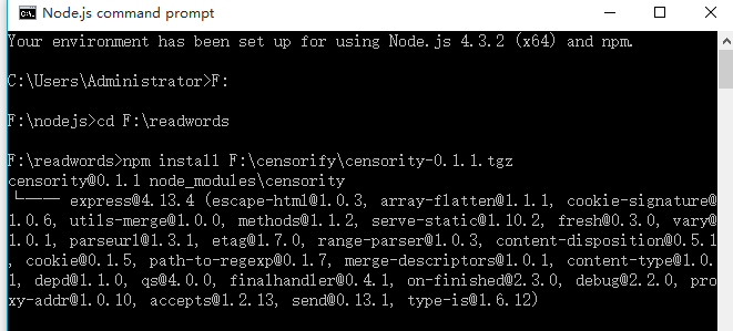 2.命令行导航到readwords文件夹下,然后安装已经封装好的模块,如果是已经发布到NPM注册表的直接 npm install 名字,如果是在本地 npm install tgz文件路径。