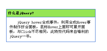 jQuery hover合成事件,利用合成Hover事件制作折合面板,鼠标Hover上面即可展开面板,与Click不尽相同,此特效代码来自锋利的jQuery一书。