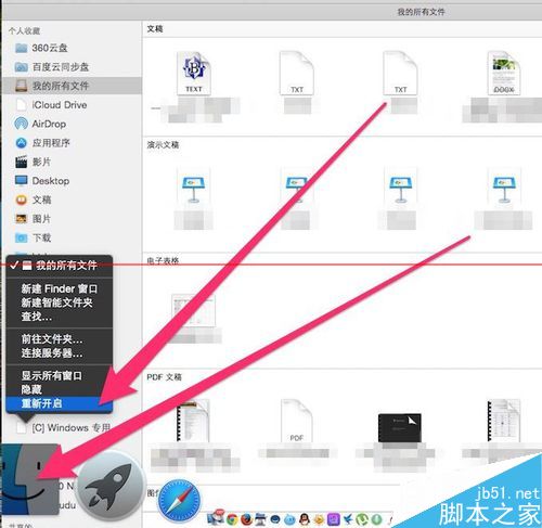 三:更佳快捷的方法是:只要按住 Option,按右键点选 Dock 上的 Finder 图示,选择"重新启动"即可