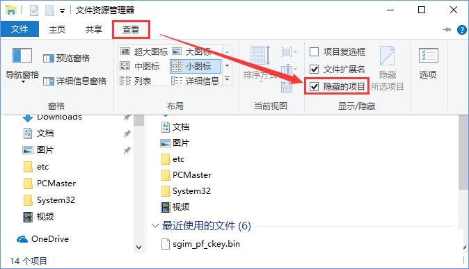 1、打开此电脑,在工具栏点击【查看】,勾选下面的【隐藏的项目】,如图: