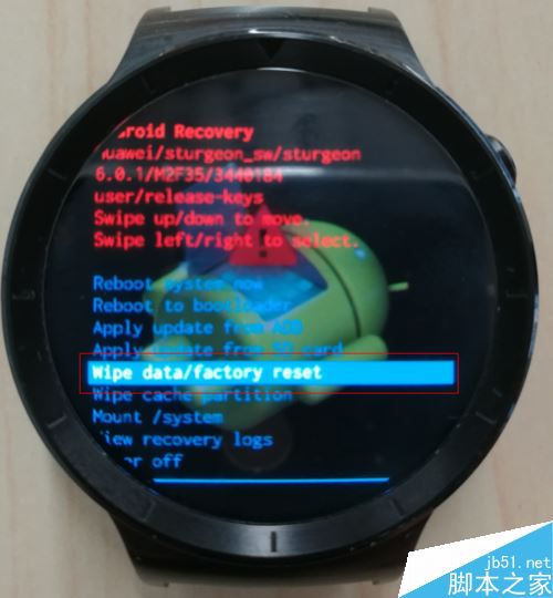 进入一个“倒地机器人”界面,滑动屏幕,选择第5项“Wipe data/factory reset”,短按侧键。