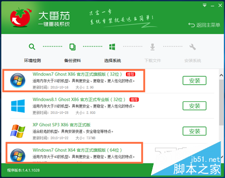 下载大番茄一键重装到电脑上,安装并打开软件,点击立即开始重装,通过环境检查和资料备份后就可以选择系统了,在这里选择你要的win7版本是32位还是64位,然后点击系统后面的“安装”,大番茄就会帮你自动完成win7系统的下载和重装过程。win10一键装回win7,就是这么简单。