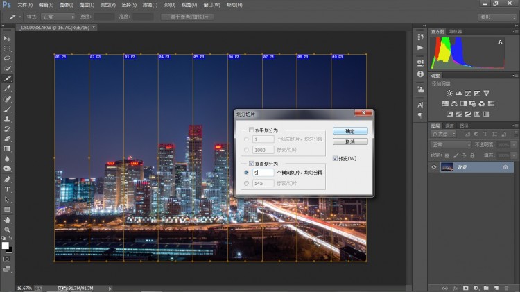 现在我们看到了传说中的切片划分工具,因为是9张照片,所以“垂直划分为9张”,之后点击确定,简单吧。下面3张图展示了详细的制作过程。