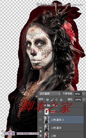 4.复制一层“人物副本”图层,改图层模式为正片叠底,不透明度50%