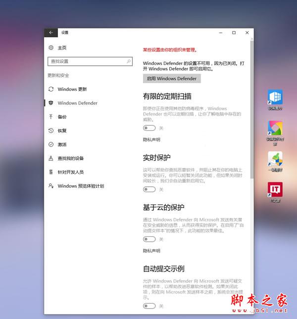 在重启电脑之后,可以看到各种Windows Defender相关的进程都没了,设置中的“Windows Defender”里面的各种功能也处于灰禁状态了,如下图所示。