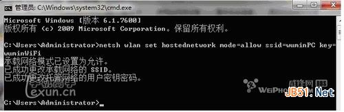 2、启用并设定虚拟WiFi网卡:运行命令:netsh wlan set hostednetwork mode=allow ssid=wuminPC key=wuminWiFi (注意:上边命令"ssid"后红字为网络名称,自己随便命名,比如wuminPC可改为MyWiFi等等,自己喜欢怎么命名都行 "Key"后边红字为密码,自己随便命名,比如wuminWiFi 可以改为12345678,总之自己命名就可以了,不一定非得这个网络名称,这个密码,密码8位以上最好) 此命令有三个参数,mode:是否启用虚拟WiFi网卡,改为disallow则为禁用。 ssid:无线网名称,最好用英文(以wuminPC为例),即要设定的wifi名称。 key:无线网密码,八个以上字符(以wuminWiFi为例),即你要设定的wifi密码。以上三个参数可以单独使用,例如只使用mode=disallow可以直接禁用虚拟Wifi网卡。相信以前用过DOS的人都知道怎么运行命令了,那就是输入按回车netsh wlan set hostednetwork mode=allow ssid=wuminPC key=wuminWiFi 运行之后看到以下内容: