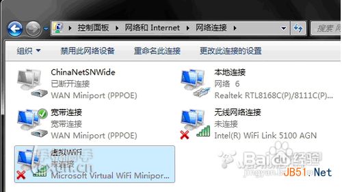 3、然后再打开“网络和共享中心”--“更改适配器设置”看看是不是多了一项,若果有多出的这一项“Microsoft Virtual WiFi Miniport Adapter”,那么说明你前边的设置是真确的。