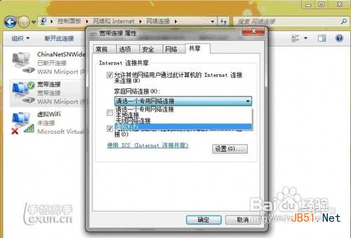 4、开启成功,网络连接中会多出一个网卡为“Microsoft Virtual WiFi Miniport Adapter”的无线。为方便起见,将其重命名为虚拟WiFi。若没有,只需更新无线网卡驱动就OK了。 3、设置Internet连接共享:在“网络连接”窗口中,右键单击已连接到Internet的网络连接,选择“属性”→“共享”,勾上“允许其他······连接(N)”并选择“虚拟WiFi”。