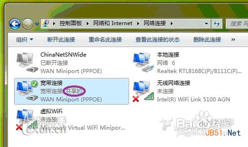 5、确定之后,提供共享的网卡图标旁会出现“共享的”字样,表示“宽带连接”已共享至“虚拟WiFi。