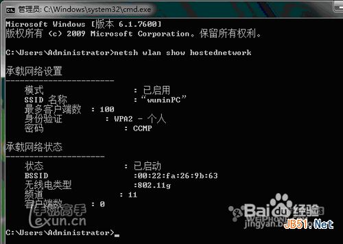7、附:显示无线网络信息命令:netsh wlan show hostednetwork