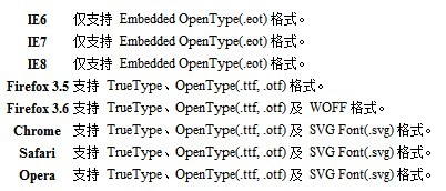 之前对“在网页中嵌入非系统自带字体”做过一点研究,虽然技术上能实现,但是对国内来说,没有太大的实际意义,因为一个中文体文件起码20M+,而且各个浏览器支持的字体文件还都不一样,也就是说,在服务器端必须有2-3个不同格式的字体文件,用来应付各个浏览器,可以看下下面这张对应图。