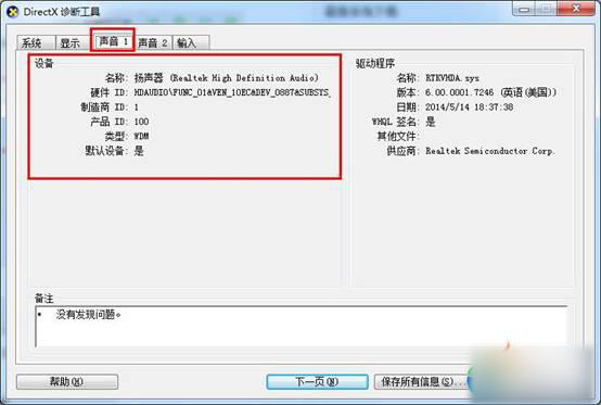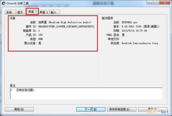 4、点击“声音”选项卡,则可以看到声卡的基本信息,如下图所示: