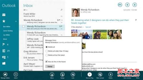 Windows Mail团队也将邮件应用定位为“Windows 8的Outlook.com客户端”,同时新增了Sweep清理,类似Outlook.com的清理功能;也有Outlook.com的社交和新闻稿类别。