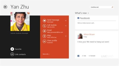 Windows 8.1 People人脉也将获得重大更新,从目前的界面来看,人脉首屏和联系人资料的更新较大,联系人姓名的首字母筛选界面也将变化。下面是联系人个人资料的界面。