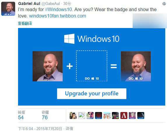今天微软Win10预览体验计划负责人Gabriel Aul在Twitter上向广大用户推荐了一个Windows10头像制作网站,这个网站可以把白色“Do Windows(徽标) 10”的图案“贴”在你的个人头像上方或者下方,用来显示“Win10用户”的身份。