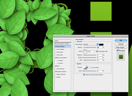 然后,将叶片粘贴到字体上,通过缩放和旋转以摆放到合适的位置。当叶片数量增多时,可通过阴影效果增加叶片的深度。