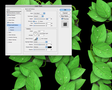 添加斜面和浮雕效果,亮绿色的高光和暗绿色的阴影使藤蔓更有立体感。