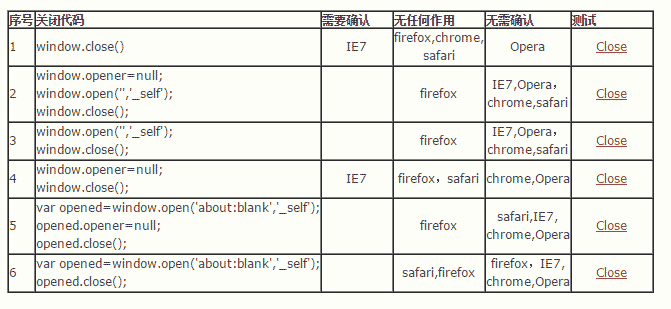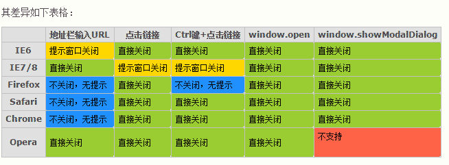 用多种方式打开一个页面,然后用 window.close() 关闭它,在各浏览器下表现有所不同。如在地址栏中直接输入URL 时,Firefox Chrome Safari 下调用 window.close() 关闭页面无效。再如 Ctrl + 点击链接打开的窗口,Firefox 下无法通过调用 window.close() 来关闭。