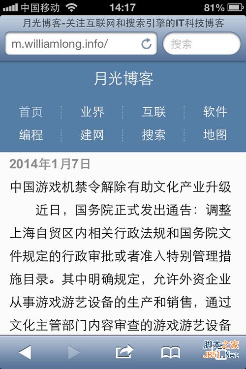 HTML5的技术门槛较高,单独开发会有不少难度,很多站长采用移动建站工具来生成基于HTML5的移动网站。目前使用较多的移动建站工具是百度 Site App,该工具使用地址参见这里,百度移动搜索会将大部分网站进行转码,转码后的内容比较适合手机移动等小屏幕设备访问,百度Site App这个工具可以支持站长将自己网站转码后的页面进行定制,并部署到自己独立子域名的网站,同时还支持通过百度联盟的方式在网页上加入针对移动设备的专用广告,以获得广告收益。下图是利用百度Site App来建立的月光博客移动网站。