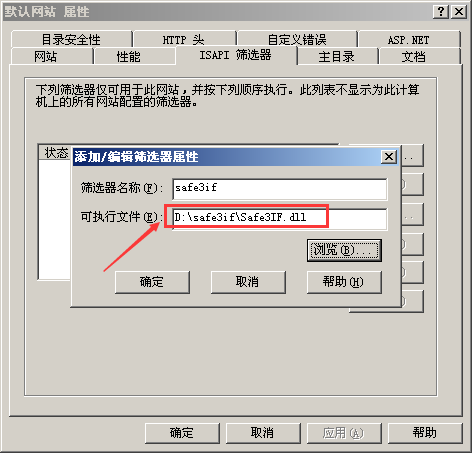 2 打开IIS管理器,选择“默认网站”,右击“属性”,选择“ISAPI筛选器”,点击“添加”,输入筛选器名称:Safe3IF,可执行文件选择上面复制到c:\windows\Safe3下面的Safe3IF.dll文件,点“确定”。
