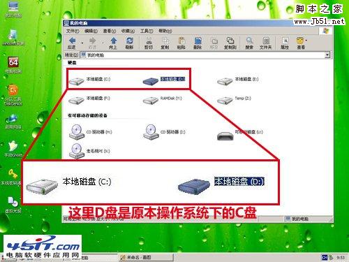 下图就是WinPE的工作界面,双击进入到我的电脑,在这里面,C盘是安装Windows7必需的100MB空间,也就是引导分区所在,而D盘就是Windows7操作系统下的C盘。