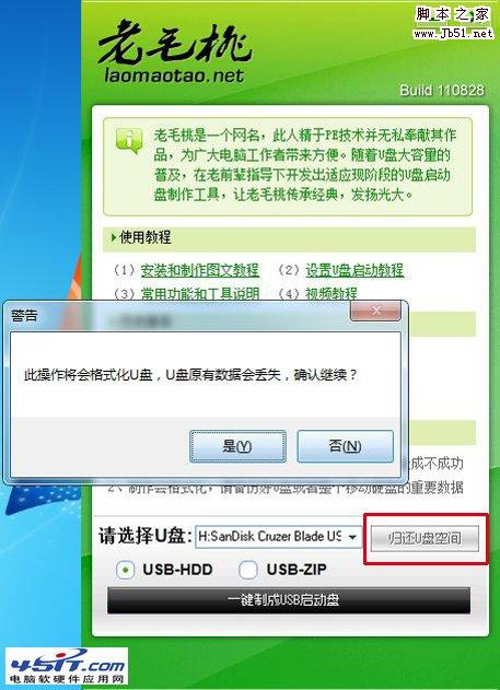 如果有需要找回占用的U盘空间,只需要连接U盘,备份好U盘之中的数据之后,启动老毛桃U盘启动盘制作工具,点击“归还U盘空间”按钮即可。