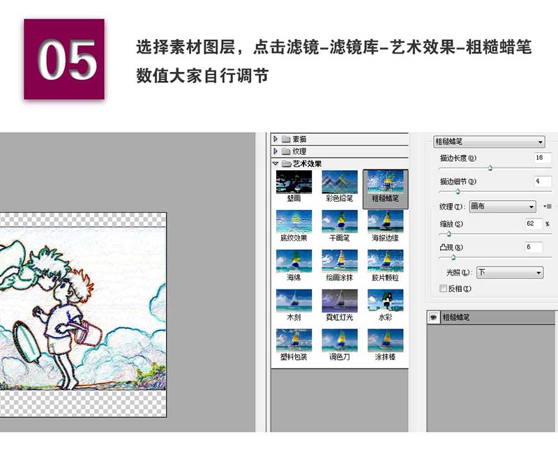 5、选择素材图层,点击滤镜-滤镜库-艺术效果-粗糙蜡笔数值大家自行调节