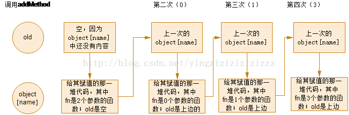 因为闭包的原因,在addMethod的函数中调用了object[name]字面量函数外部的变量old,这使得垃圾回收机制不会回收old,所以old会一直存在内存中,不会消失,我们就是利用的这个特性实现的继承。