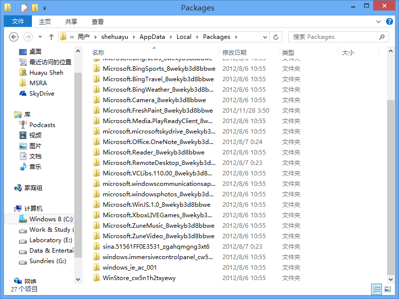 从图中可以看出,识别这些 App 究竟对应开始屏幕里面哪个 Modern App 其实并不难,因为文件夹的部分就是该程序的名称.例如我们可以看见最后一个,"WinStore_cw5n1h2txyewy",它无疑就是"应用商店"这个应用的内部名称.