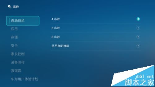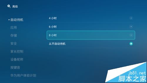 3、高级设置里面第一个选项就是自动待机,右边则是进入自动待机的时长,有4/6/8小时,和从不自动待机,意思分别是盒子无遥控操作,无播放时4/6/8小时候盒子将待机。如果选择从不自动待机的话,意识无论如何盒子都不会进入待机模式。