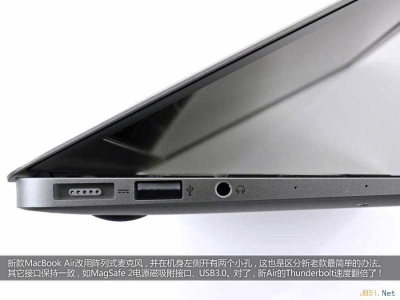 新款MacBook Air改用阵列式麦克风,并在机身左侧开有两个小孔,这也是区分新老款最简单的办法。接口方面则基本保持一致,如MagSafe2电源磁吸附接口、USB3.0。对了,新Air的Thunderbolt速度翻倍了!