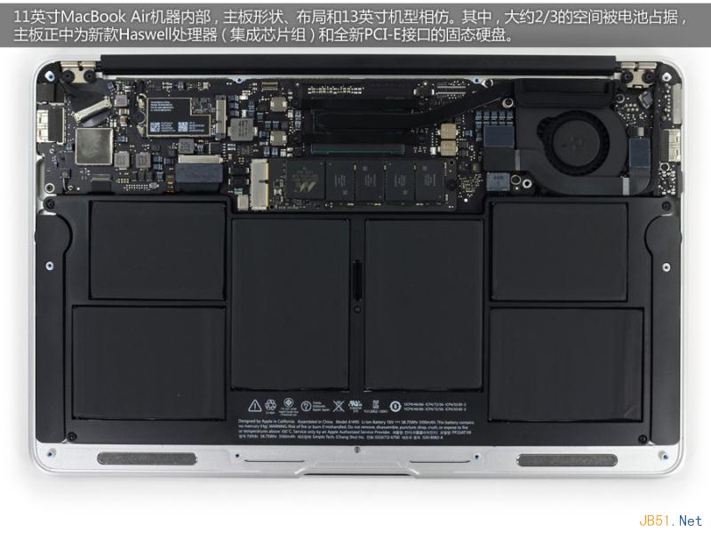 11英寸MacBook Air的机器内部,主板形状、布局和13英寸机型相仿。其中,大概2/3的空间被电池占据,主板正中为Haswell处理器和全新PCI-E接口的固态硬盘。